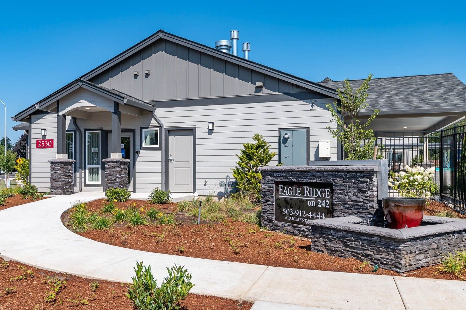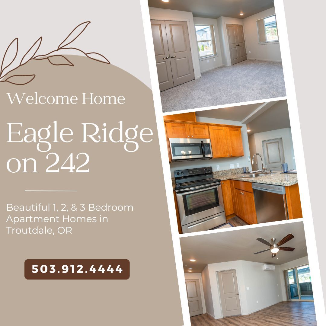 Welcome to Eagle Ridge on 242, a brand-new Troutdale apartment community. Located just minutes away from I-84, East Portland, Gresham, and Fairview. We offer more than just a place to live, Eagle Ridge on 242 offers a lifestyle. Our exceptional apartments offer contemporary interior finishes. All of our apartments feature granite counters, plank floors, shaker cabinets, full size washers & dryers, air conditioning, fireplaces, oversized closets, private back patios with extra storage, and a complimentary assigned carport.